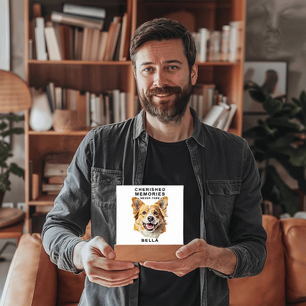 Each plaque is meticulously crafted from high-quality, transparent acrylic, giving a modern, glass-like elegance to the piece. Your pet's portrait, drawn from a photo you provide, is printed with vibrant, long-lasting colors that bring your pet's image to life. Above the portrait, a heartfelt phrase of your choosing is added, adding a warm, personal touch. Below the name, your pet's name is printed, further personalizing this special memorial.